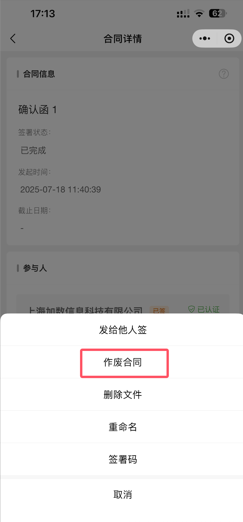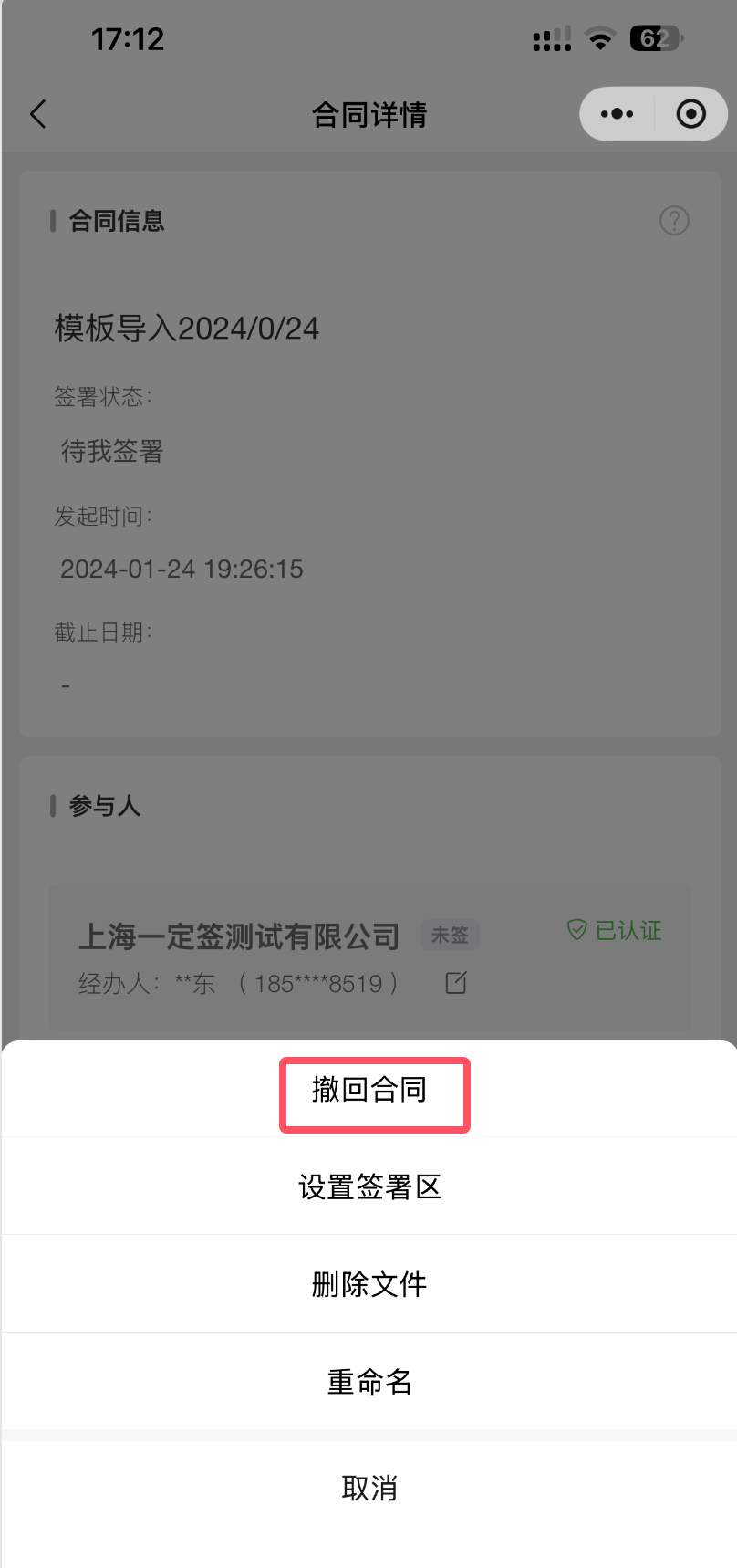 如果合同还未签署,发起人可以直接点击合同详情页下方的撤回按钮,可以撤回合同;